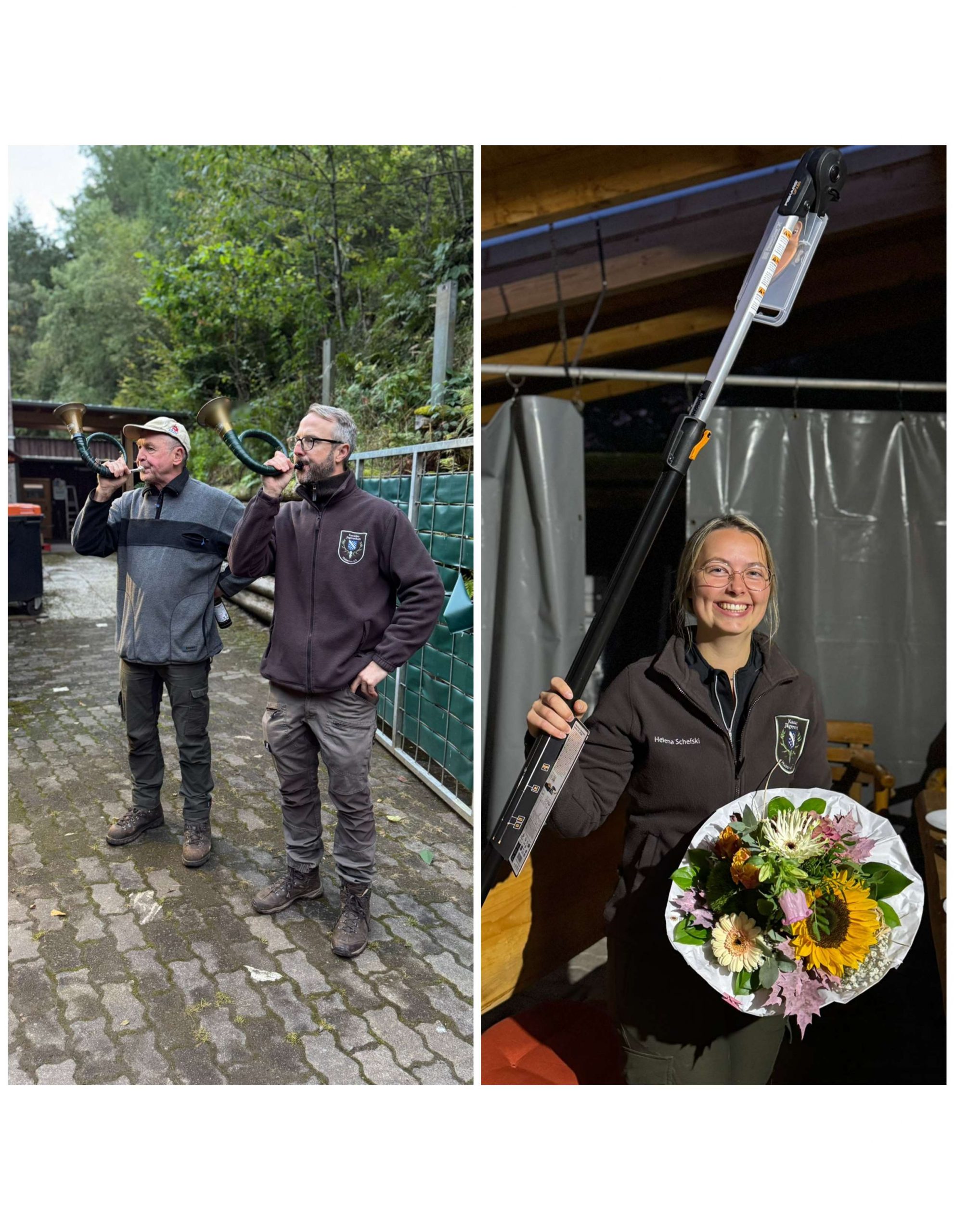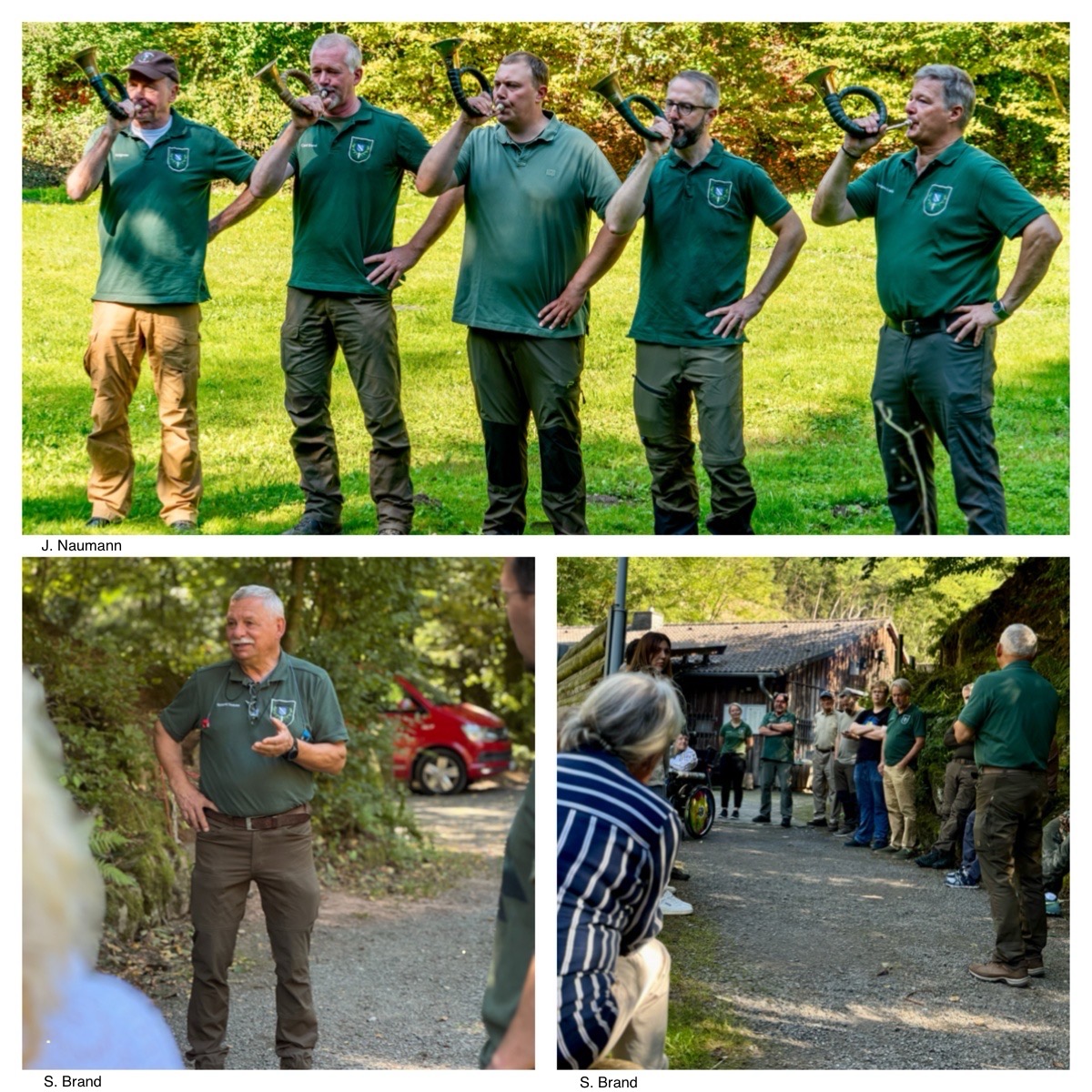 Axel Krügener und Michael Walkus aus dem Vorstand der Kasseler Jägerschaft Hubertus e.V. haben die Gruppe zum Einstieg mit dem Jagdhorn begrüßt.