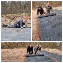 Heute gab es mal eine ganz andere Tätigkeit auf unserem Schießstand. Achim, Frank, Kalle und Willi waren im Bergeinsatz unterwegs. Auf dem Steilhang gegenüber vom Trapstand wurden in dem Bereich, wo die Tontauben landen, Gummimatten ausgelegt. Warum? Im Schießbetrieb bilden die Matten als Hintergrund einen guten Kontrast zu den Tontauben. Gleichzeitig werden die Tontauben am Hangfuß konzentriert und können von dort leichter aufgesammelt und entsorgt werden. Bisher war dies extrem aufwendig, da das Gelände fast nicht zu begehen ist. Die Tauben mussten mit viel Körpereinsatz und jeder Menge Schweiß zusammengerecht werden.